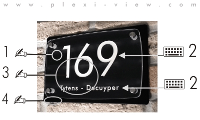 3) optional installation without drilling with BACKGROUND PLATE : the background plate is adhesive prepared and can be stuck to any surface, wall or postbox. The housesign is removable by simple screw system. (n°4+n°5/3) + € 55.00