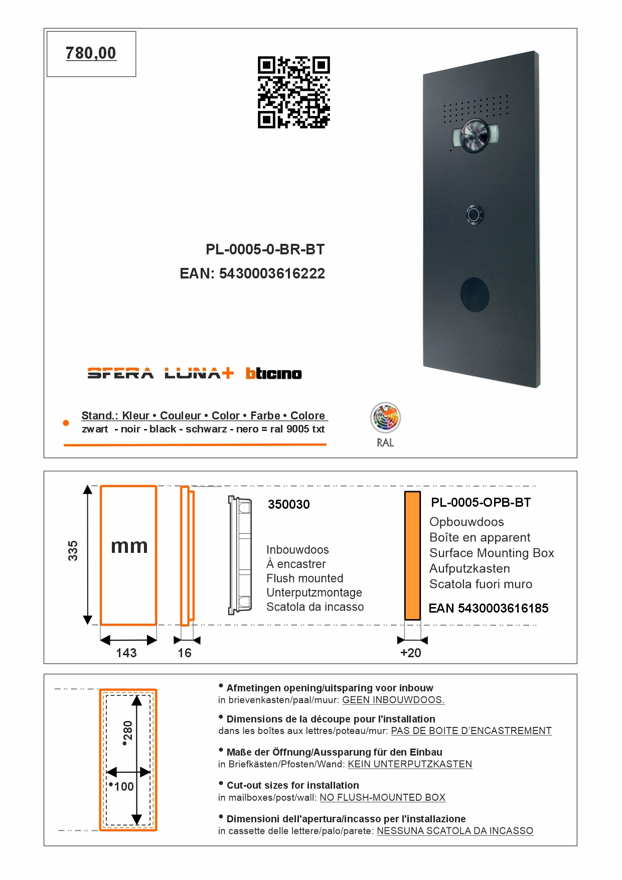 Pour poste extérieur Bticino 351300 avec objectif grand angle angle de vue: horizontal 135°- vertical 96° & lecteur de badge 353200 (module RFID) pour être employé avec les clés de badge 348200 1/2/3/4/5/6 (clés à transpondeur) Un design épuré. Elégant à l'entrée de votre maison, appartement, portail ... Platine de rue design, standard disponible toutes le couleurs RAL Ces platines de rue sont disponibles dans toutes les couleurs RAL, assorties avec la couleur RAL de votre maison ou projet.
