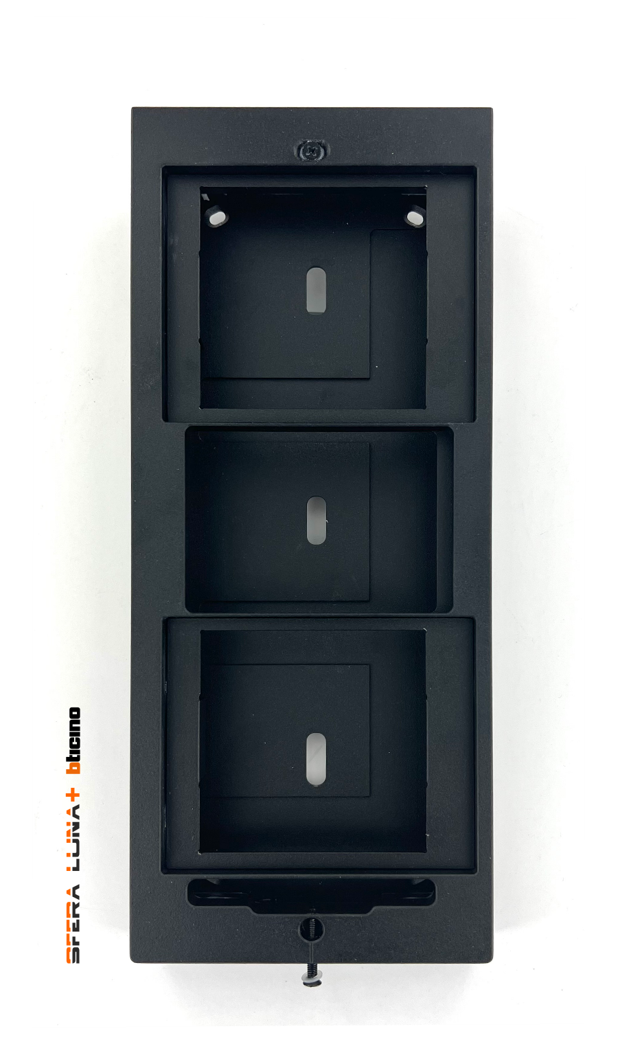 Custodia da parete dal design moderno in alluminio, sviluppata appositamente per i posti esterni BTicino SFERA LUNA a 3 moduli. La custodia combina un'estetica elegante con una maggiore resistenza agli atti vandalici ed è adatta sia per applicazioni residenziali che professionali.