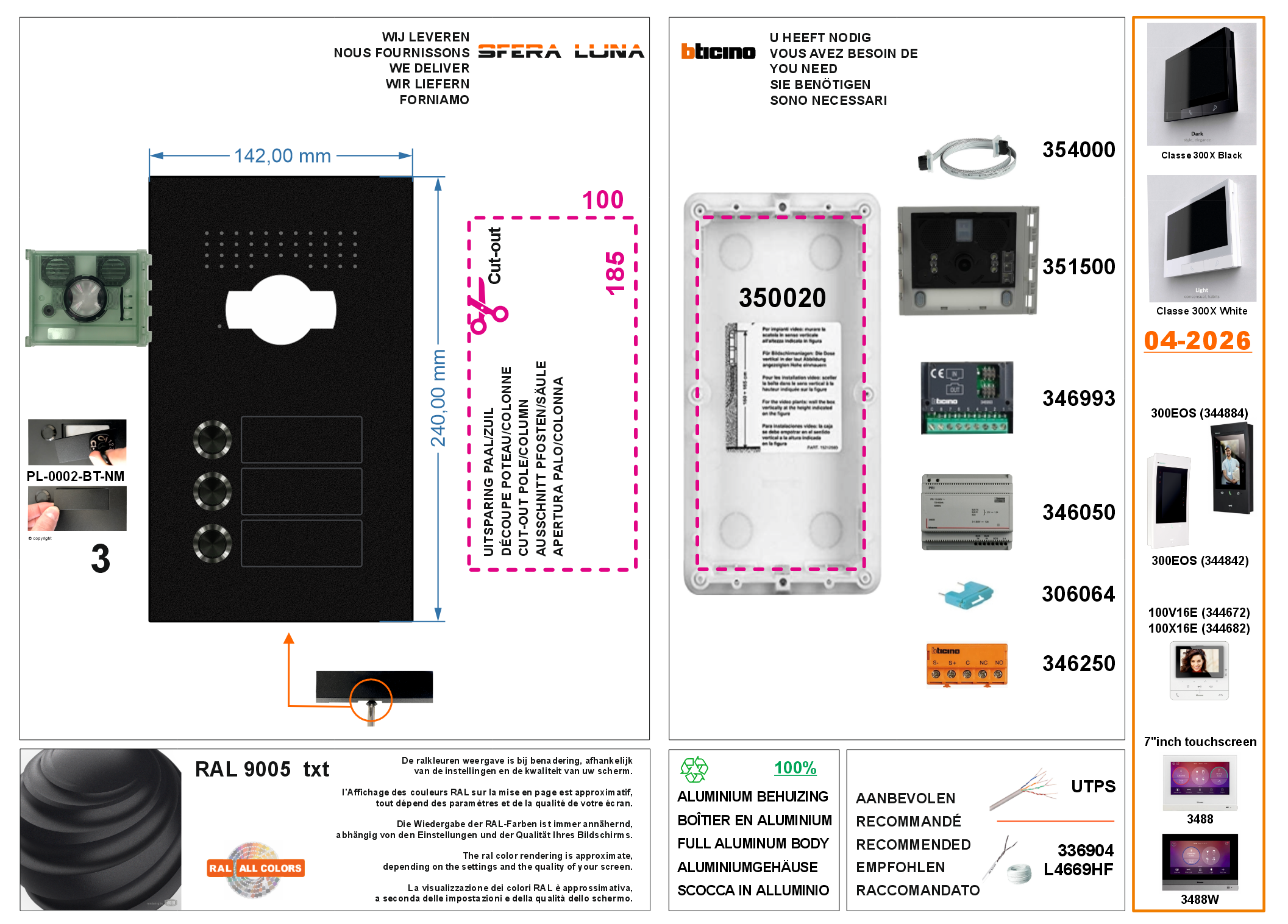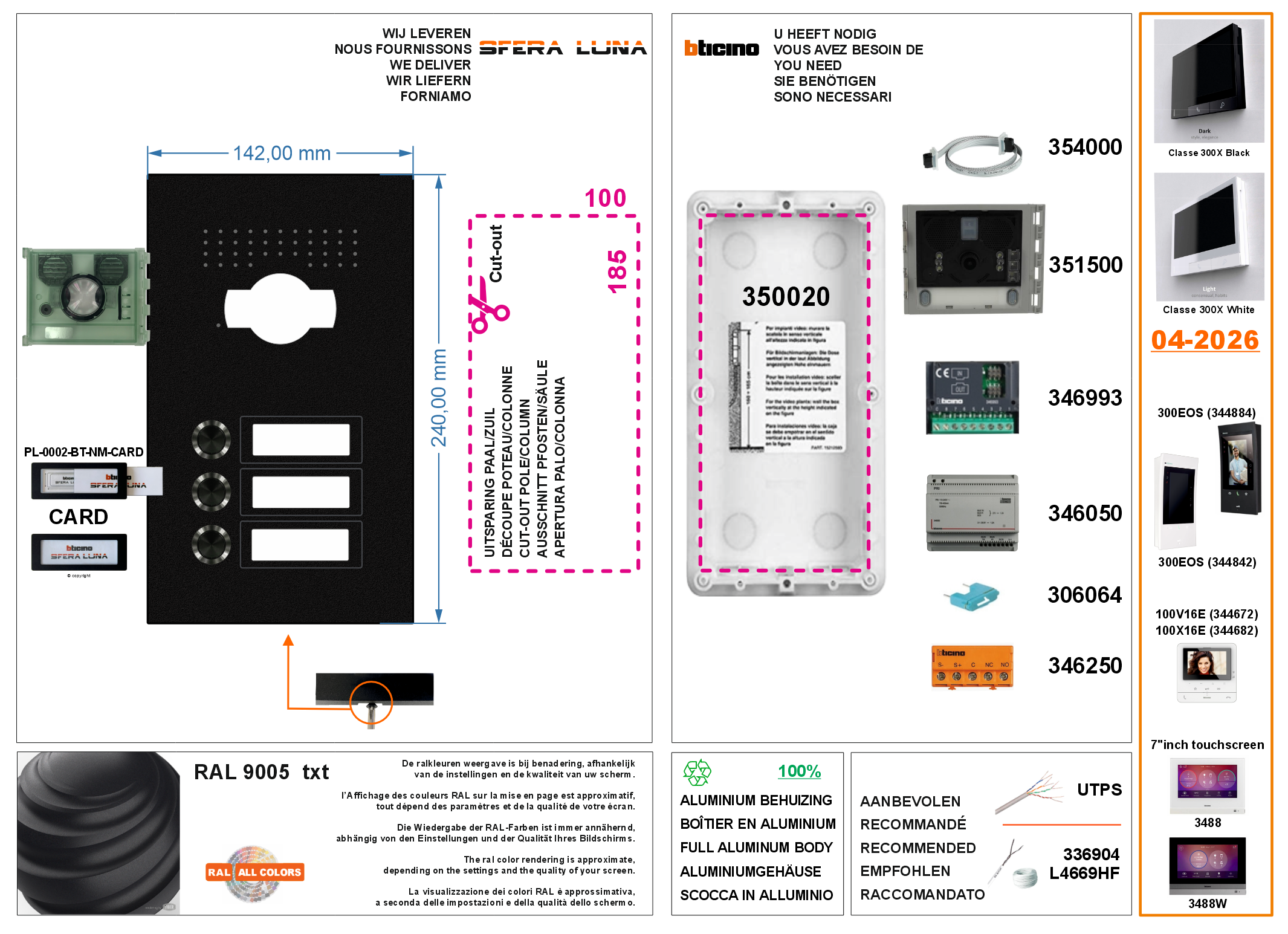 SFERA LUNA combineert hoogwaardig design met duurzame materialen en een perfecte integratie van BTicino video-parlofonie. De frontpanelen worden vervaardigd uit massief aluminium en zijn ontworpen voor moderne woningen, residenties en architecturale projecten waar esthetiek, kwaliteit en betrouwbaarheid centraal staan.