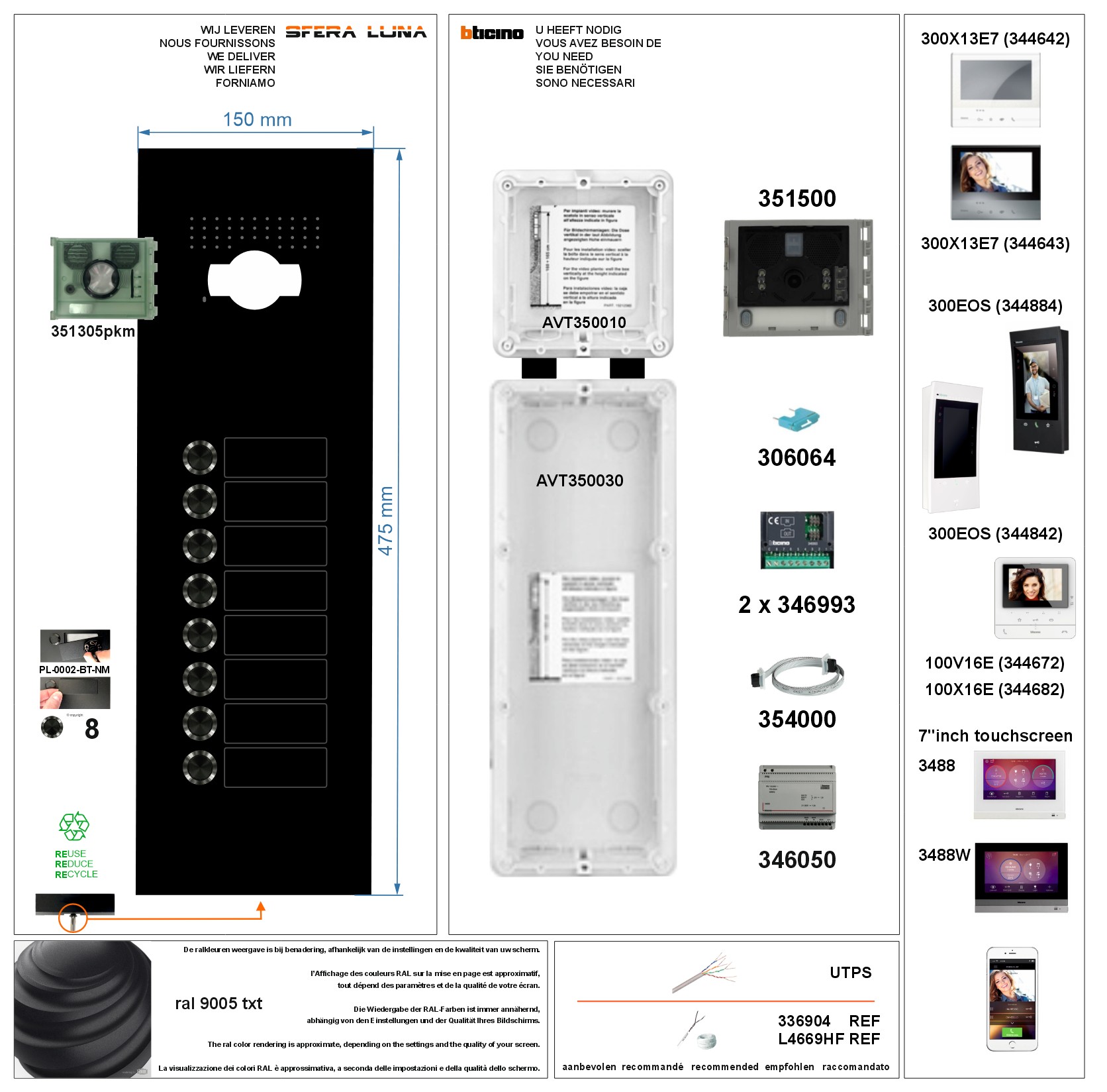 - Compatible with all Bticino indoor units: Class 100X16E (344682) or Class 300 X13E7 wifi-3/4G (344642) or MyHOME_UP 7" Hometouch (3488) or Class 300EOS (344842)
