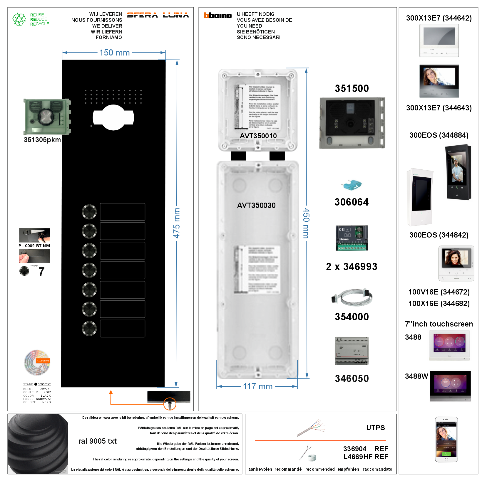 - Compatible with all Bticino indoor units: Class 100X16E (344682) or Class 300 X13E7 wifi-3/4G (344642) or MyHOME_UP 7" Hometouch (3488) or Classe 300EOS (344842)