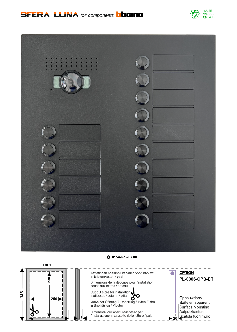 Installation auf Standard-Unterputzdosen Bticino 350030, auch als Aufputzversion erhältlich.