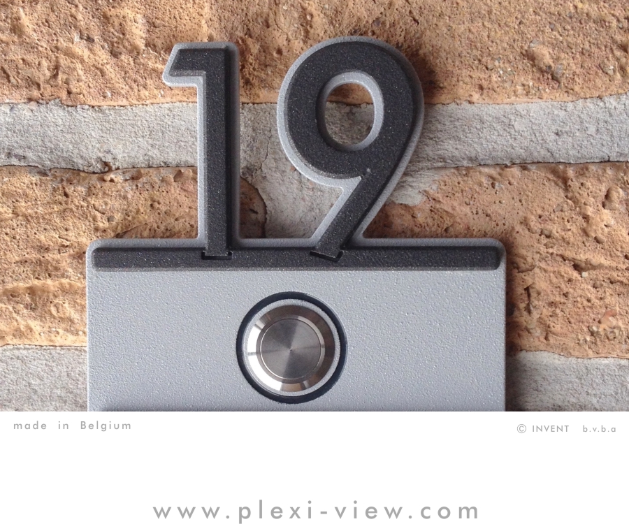 Numéro de maison avec sonnette et noms. Modèle CUTE en aluminium anti-corrosion revêtu par poudre avec un traitement anti-graffiti de surface.