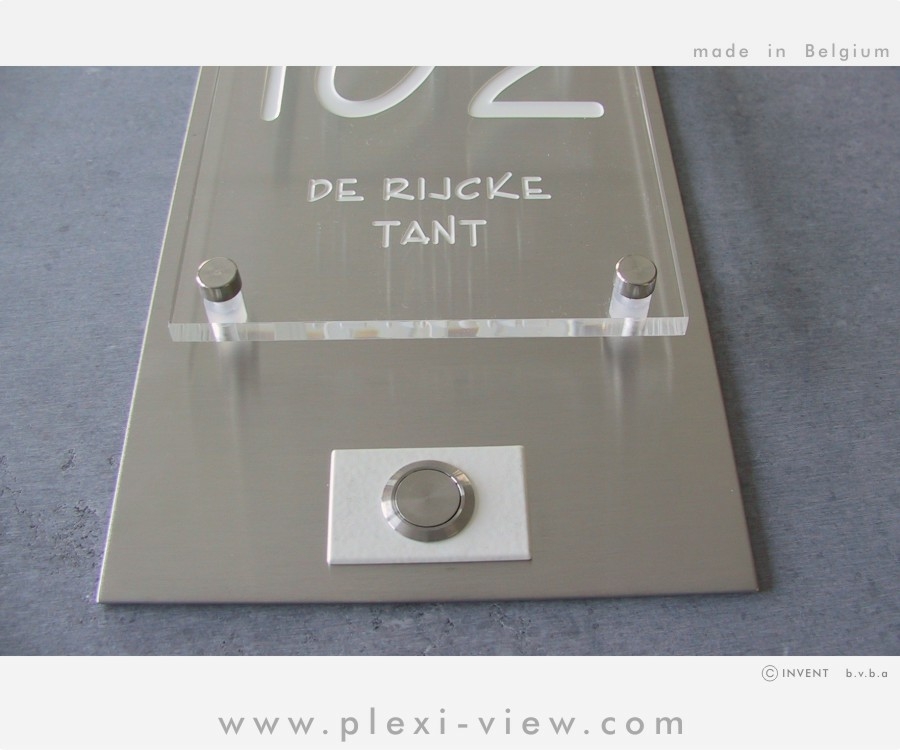 Engraved and lacquered with high quality UV-lasting coating available in all RAL colors. This model can always be combined with backgrounds in inox 316 (RVS) or powder coated aluminium.